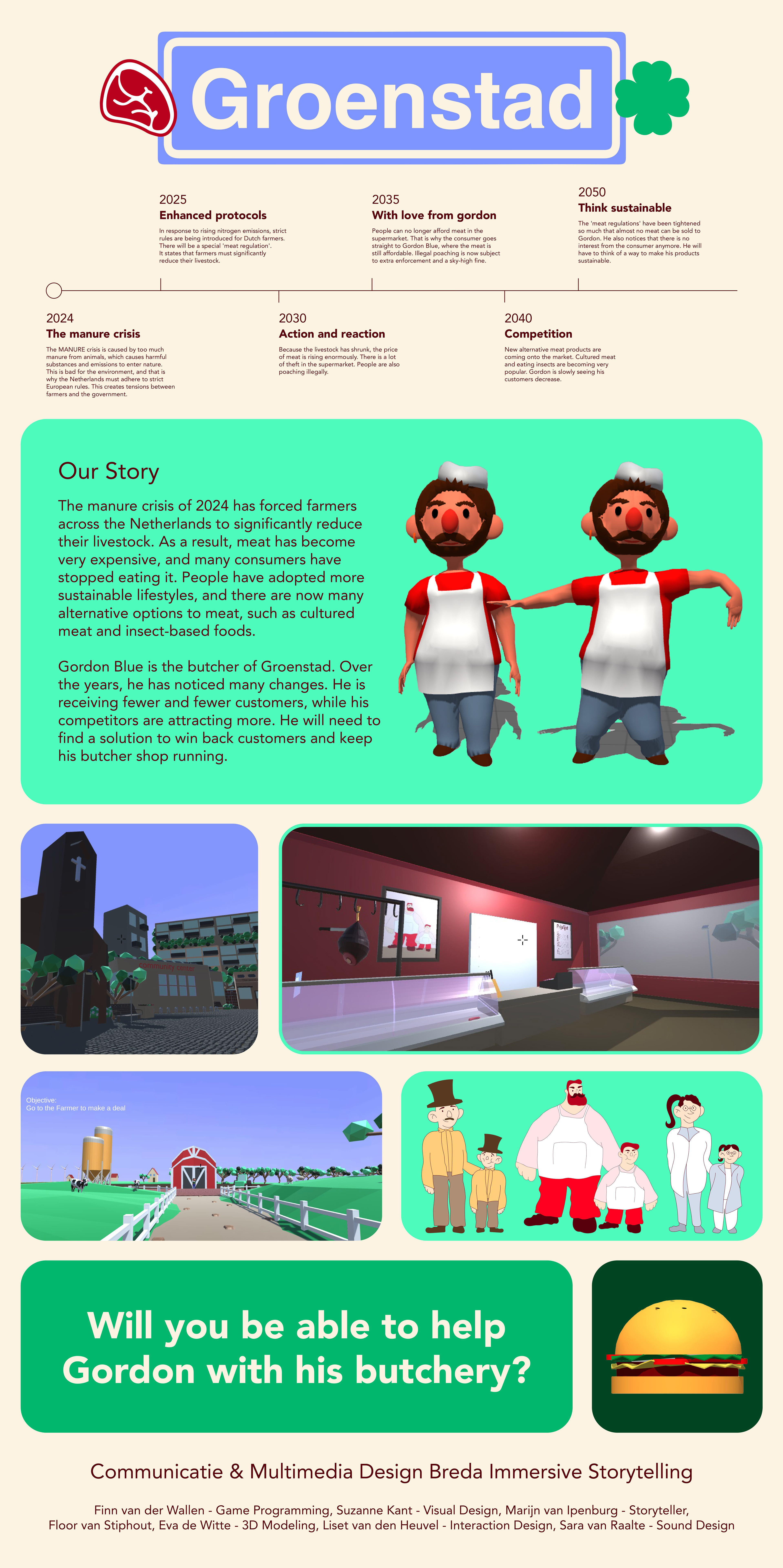 The game is about Gordon Blue, the butcher of Groenstad, a town where sustainability is a way of life. The game invites players into a world increasingly driven by green, vegan-friendly lifestyles. At the heart of the game is a butcher in a small Dutch town, struggling to survive as meat consumption declines. Players experience firsthand the challenges of running a business in a society where animal agriculture is no longer dominant.